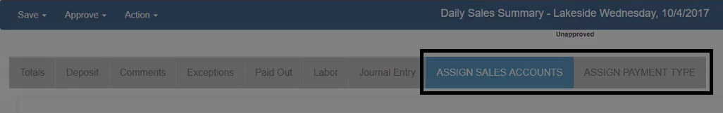 - On the Journal Entry tab of each Daily Sales Summary transaction, there is an 'Assign' button whenever a Sales Account associated with that day is missing a GL Account. The Sales Account Setup screen can be accessed directly from the Daily Sales Summary record by clicking on the 'Assign' button highlighted below. This makes it easy to quickly assign the GL Account and then Approve the Daily Sales Summary transaction.