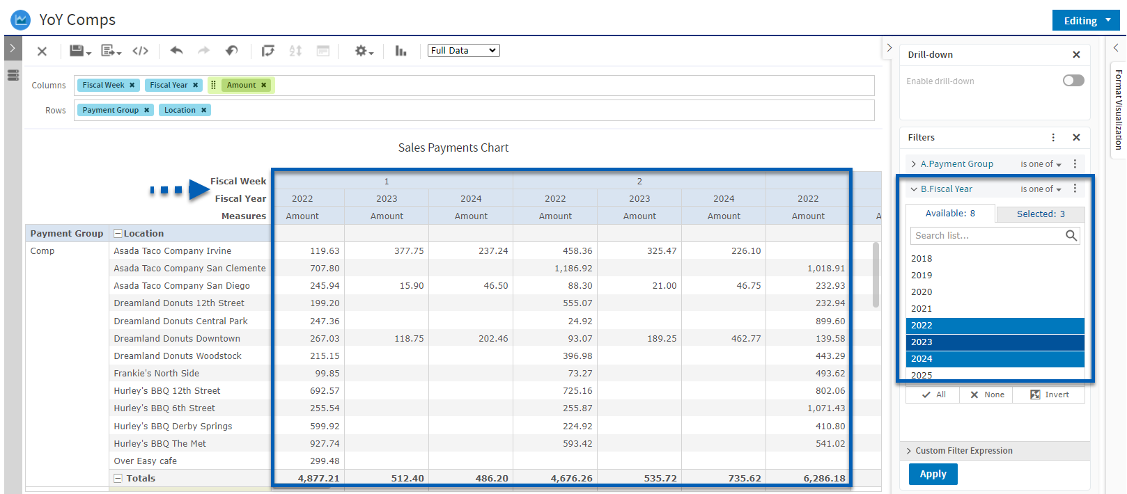 Fiscal Day, Week, and Period will be the same each year. Use Fiscal Year, Week, or Period as the column. Then, filter the report for a specific Fiscal Period, Week, or Day, that should give you what you’re looking for. In the example above, the years 2022, 2023, and 2024 are selected. This shows each year as a column for each fiscal week.
