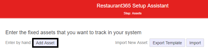 On the 'Assets' step of the 'Fixed Assets' section in the Setup Assistant, click the 'Add Asset' button to open the 'Add New Asset' Prompt and create a new Asset.