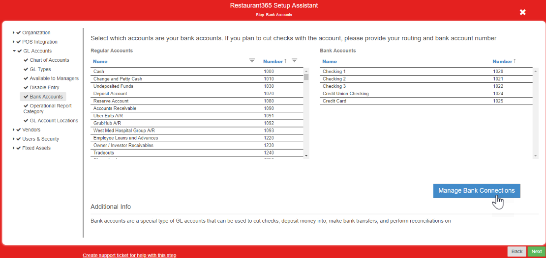 - To access the Manage Bank Connections wizard from the Bank Account record, select the bank account to open the GL Account screen, and then select Manage Bank Connections on the General tab.