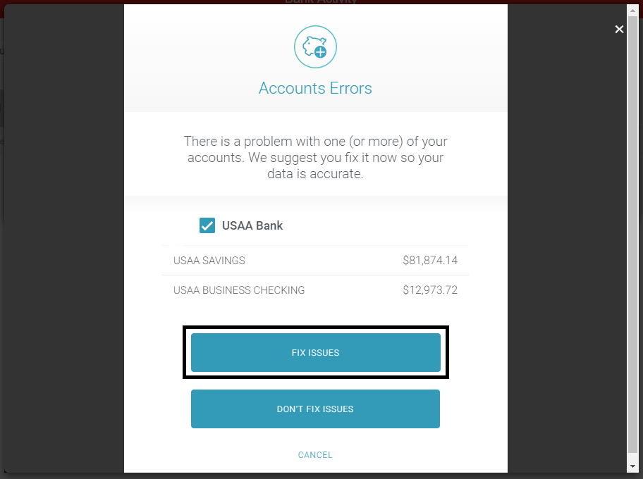 - Unable to Retrieve Activity - You might have a Connection Status of 'Connected', but be unable to retrieve activity. If this is the case, and the Connection Status says 'Connected' (or if it says 'Not Connected'), you can use the 'Manage Bank Connections' prompt to verify that the selected Bank Account has been linked to a connected account. Open the 'Manage Bank Connections' prompt and click 'Add Bank' to open the Connections Manager. If your credentials have changed, you will be prompted to update them.