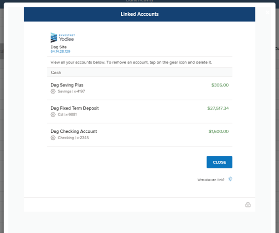 - Account Refresh - If an account needs to refresh, a 'Linked Accounts' modal will appear showing that the linked account has been refreshed, as displayed below. Click 'Close' to retrieve its bank activity.