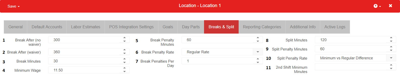 The settings used to calculate Break Penalties and Split Shift Premiums are stored on each Location record on the Breaks & Split tab. The following fields are available for you to define that will be used to calculate these penalties: