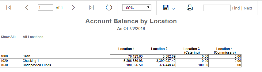 The Account Balance by Location report displays the totals for a specific GL Account for all Locations. The User is able to view the debits and credits of one or more account(s) across multiple Locations for a better look into account details.