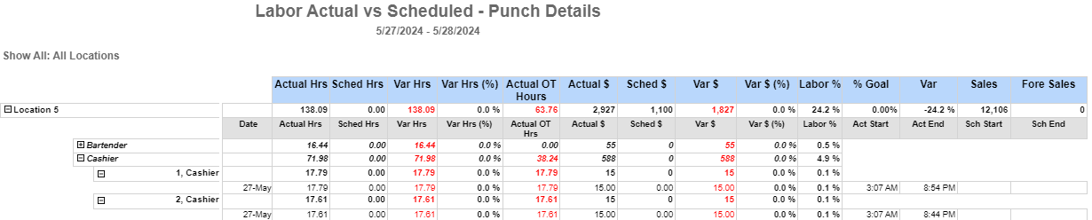The Labor Actual vs Scheduled - Punch Details report runs the numbers for each employee's labor punches in a specified date range. This report helps users understand and analyze labor variances, particularly in regards to the actual punch details rather than the simple breakdown of hourly labor.