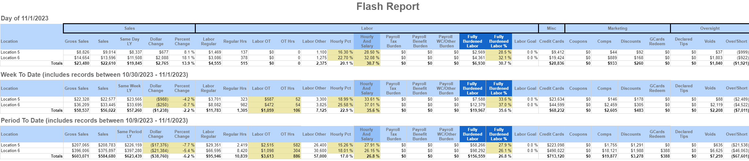 The Flash Report shows summary information based on a single day’s performance in one or multiple locations. All information from the Daily Sales Summary flows through this report as well as historical information and Labor numbers. This is a great report to run to view a snapshot of the previous day's Sales, Labor, and other daily metrics. Most above-store managers/operators will find this report very useful for getting a high-level report of the day in each store. It is important to note that since this is an operations-based report, it is based on the Operational Calendar.
