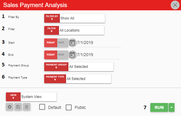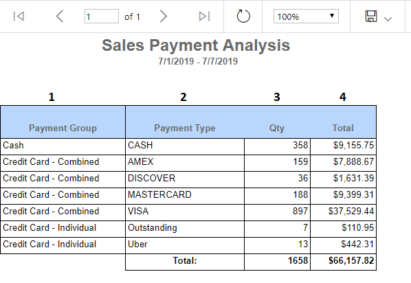 The Sales Payment Analysis Report displays all the Payment Types associated with each Payment Group. This report displays a clear distinction between Payment Types so a User can see how payments are most often made.