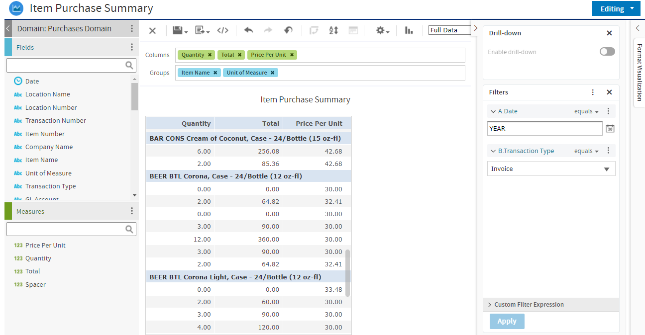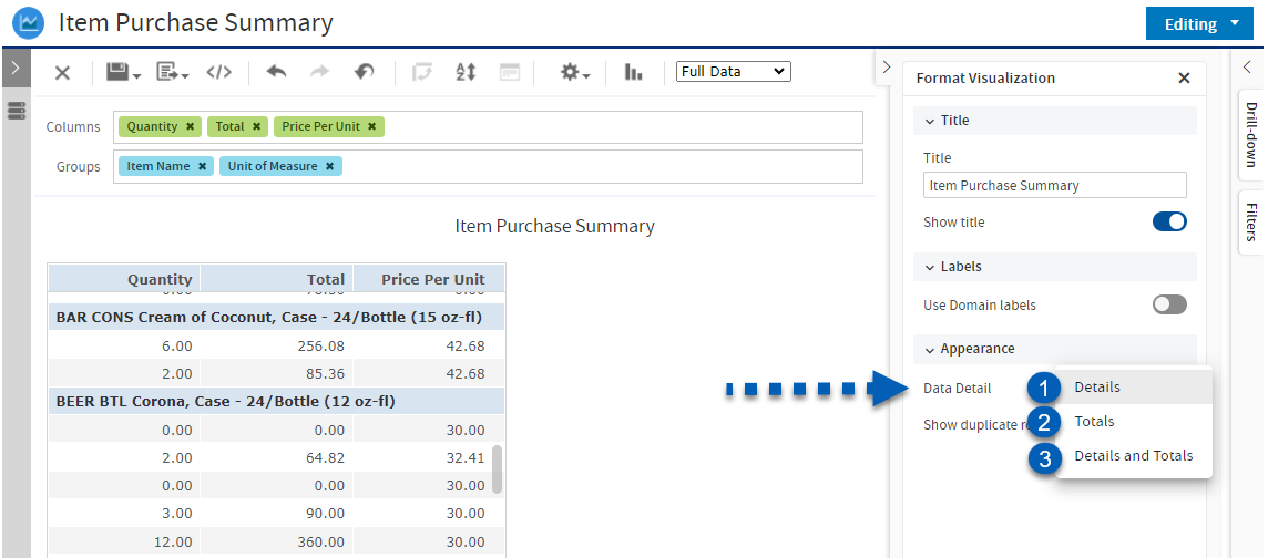 With a Table visualization, the Format Visualization panel will have a Data Detail option dropdown where users can select the type of data that will display in the table.
