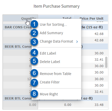 | 2 | Add Summary | Adds a totals box at the bottom of the column for that field or measure. |