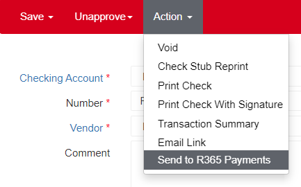 To resend the payment, simply click 'Send to R365 Payments' under the 'Action' menu in the top ribbon of the desired payment.