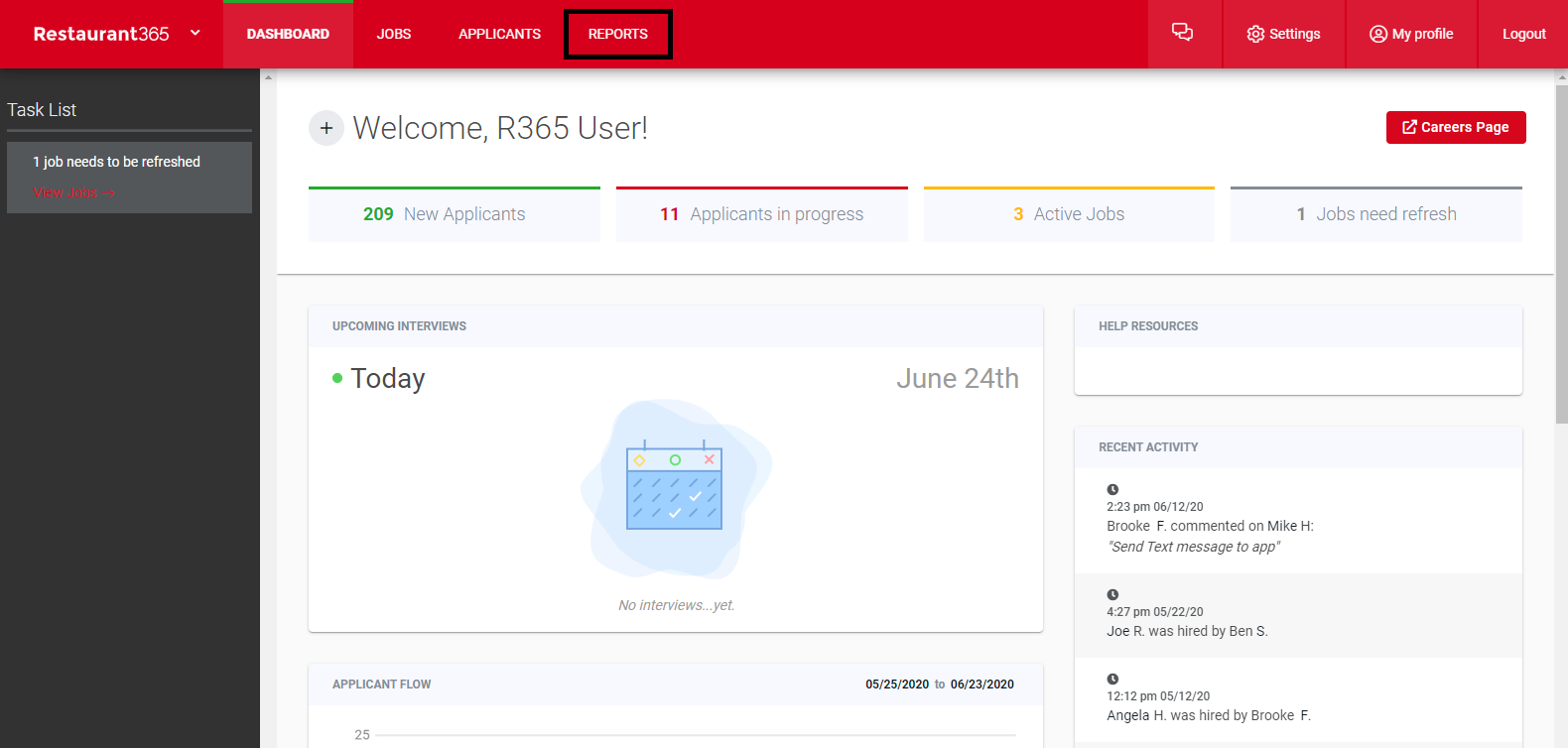 On the Recruiting Dashboard, open Recruiting Reports by clicking 'Reports' in the top ribbon.