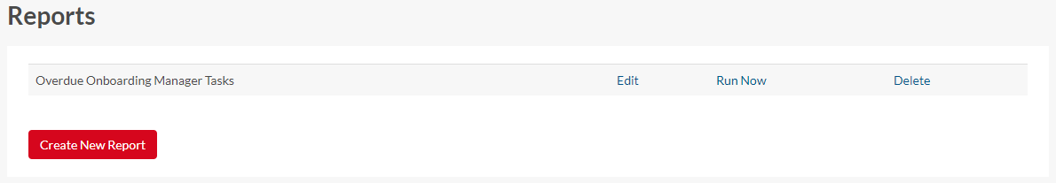 The 'Reports' window will open and display all User-created Onboarding reports. Existing reports can be edited, ran, or deleted from this window as needed. To create a new report, click 'Create New Report'.