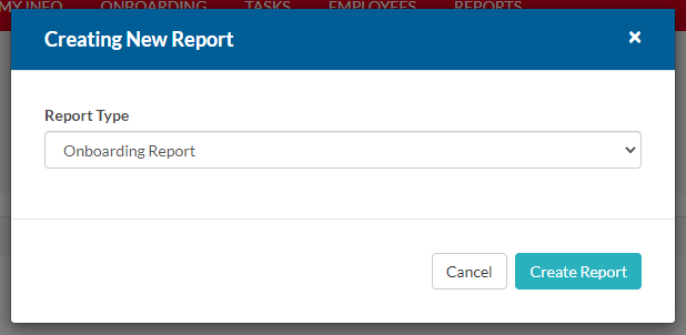 A 'Creating New Report' modal will appear. Select the desired Report Type and click 'Create Report'. Report Types include 'Onboarding Report' and 'Employee Report'.