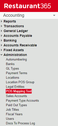 Navigate to the POS Account Mapping Tool by clicking POS Mapping Tool under Administration in the Accounting module. | |