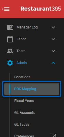 | Navigate to the POS Account Mapping Tool by clicking POS Mapping under Admin in the left navigation menu . |