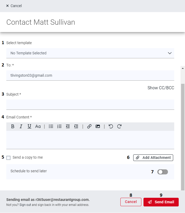 4) Email Content - The main message of the email. This will auto-populate when a Template (#2) is selected