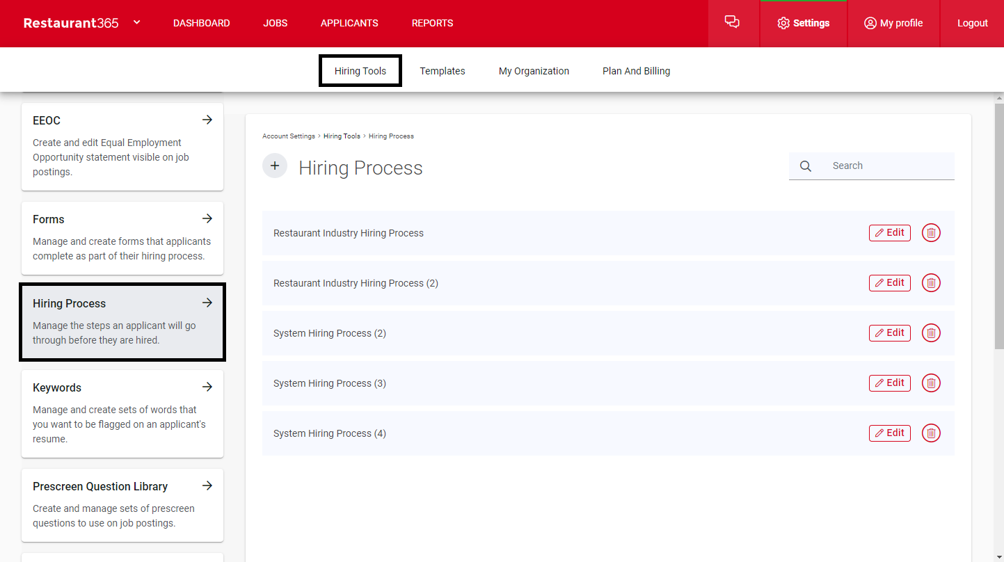 Hiring Processes are hiring workflows that help to structure the steps of each unique Hiring Process. The system displays default Hiring Processes that can be updated to better reflect the organization's hiring workflow. It is recommended to adapt these processes as they pertain to each Job and/or Department within the organization.