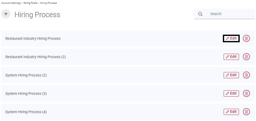 The Hiring Process listing will display all current Hiring Processes. To create a new Hiring Process, click the plus sign