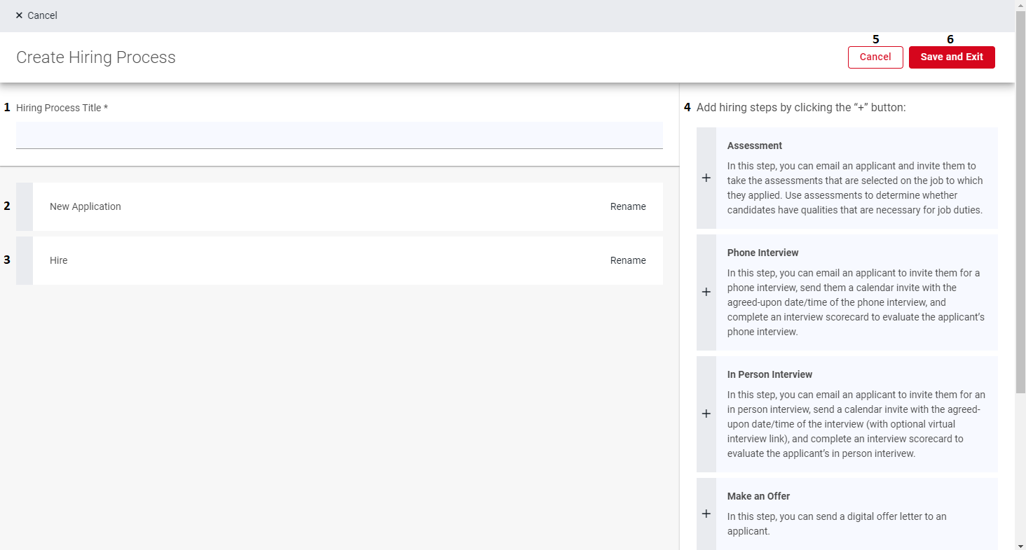 6) Save and Exit - This will save the Hiring Process and return to the Hiring Process listing