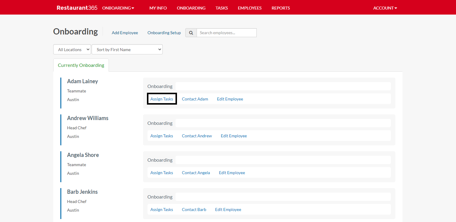 Tasks can be assigned in two ways: the Onboarding Dashboard or the Checklists listing.