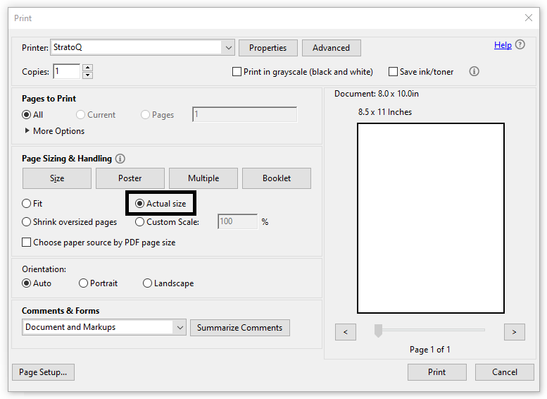 - Adobe - When printing from Adobe, the 'Page Sizing & Handling' should be set to 'Actual Size'