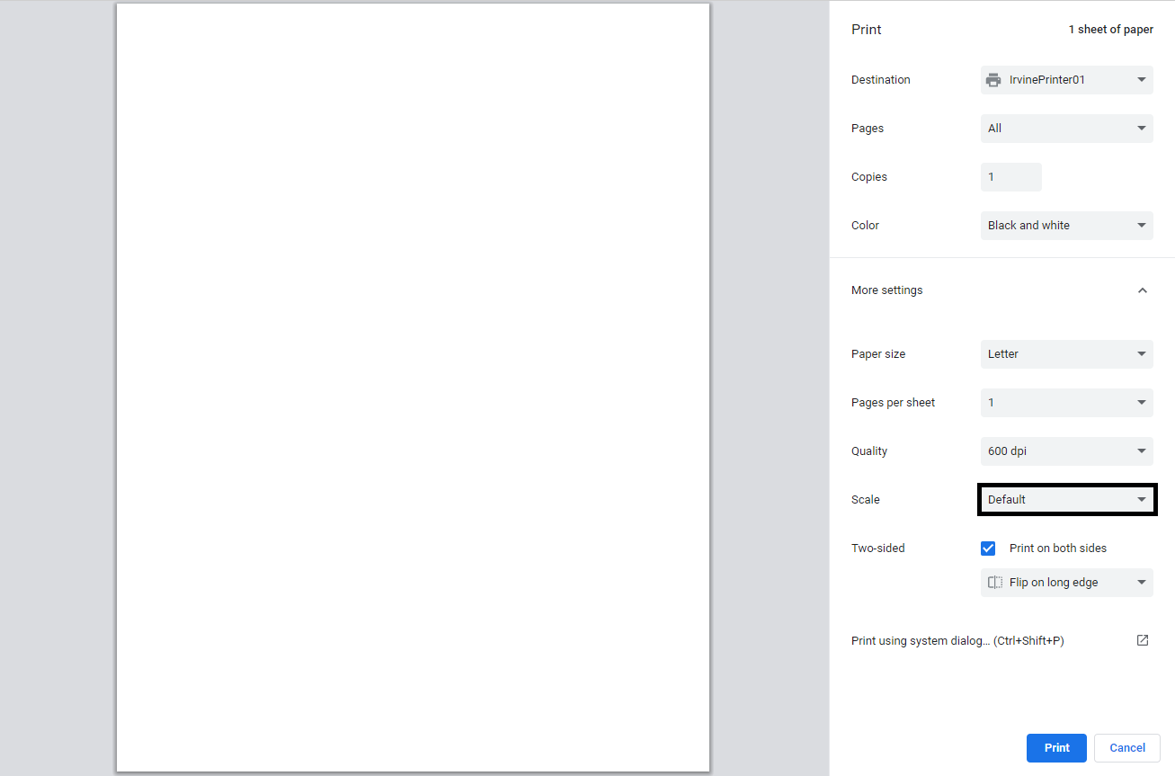 - Chrome - When printing from Chrome, 'Scale' should be set to 'Default'