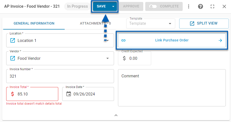 Once the AP invoice is marked as complete. The Link Purchase Order button will automatically update to reflect the purchase order number that the system has linked the invoice to.