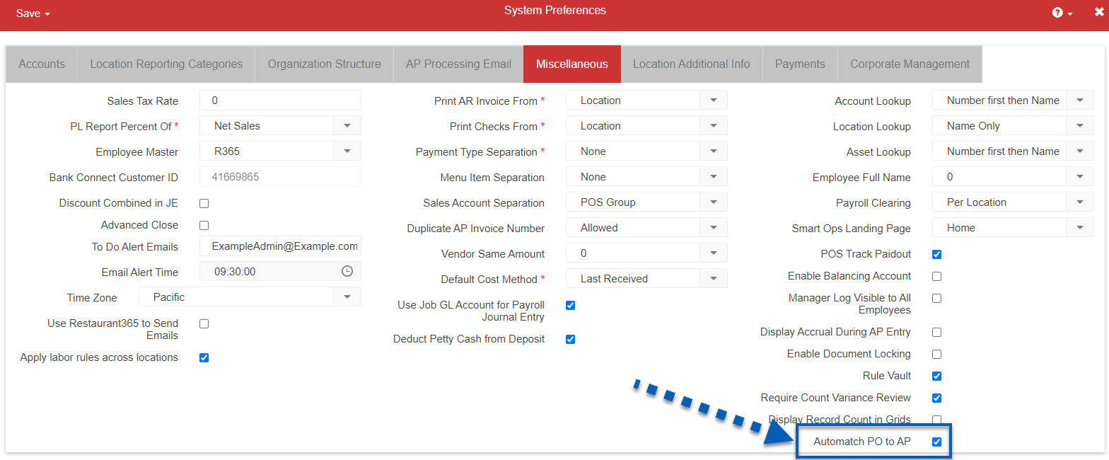 To enable automatching, ensure that the Automatch PO to AP checkbox is checked. To disable this feature, ensure that the checkbox is unchecked.