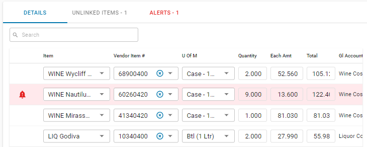 Threshold Violation alerts will be displayed if the corresponding item's 'Each Amt' is outside of the acceptable variance set for the Item or its Item Category 3. The Threshold Violation alert is indicated by a red highlight and alert icon.