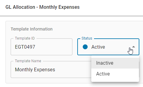 GL Allocation Templates will have a status of either 'Active' or 'Inactive', which will enable them to be available or unavailable, respectively. When a new GL Allocation Template is created, it will have a status of 'Inactive' and can only have its status changed once the template is saved.