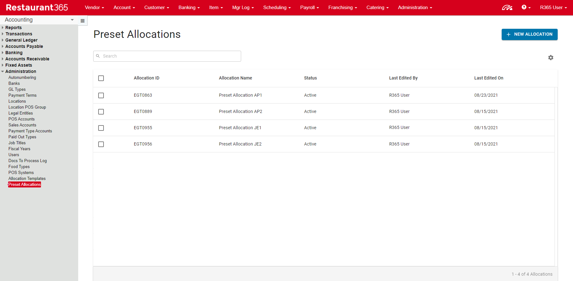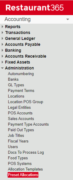 Preset Allocations can be created and are housed in the Preset Allocations page, which can be opened by clicking 'Preset Allocations' under 'Administration' in the Accounting module.