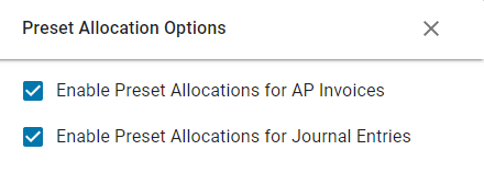 8) Settings - This will open a sidesheet that includes the types of transactions that can have Preset Allocations enabled for them. To enable or disable Preset Allocations for AP Invoices, Standard Journal Entries, or both, simply check or uncheck, respectively, the desired enable transaction box in this sidesheet