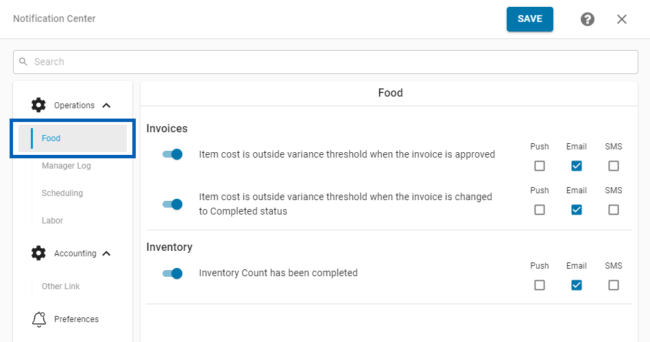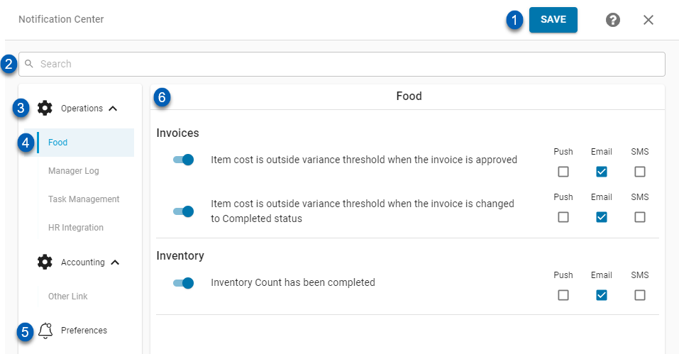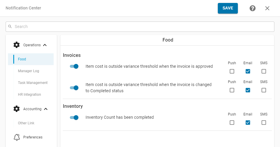 The Notification Center allows Users to enable/disable the Notifications that are delivered to them, as well as set preferences for how those Notifications are delivered (Push Notification, Email, and/or SMS).