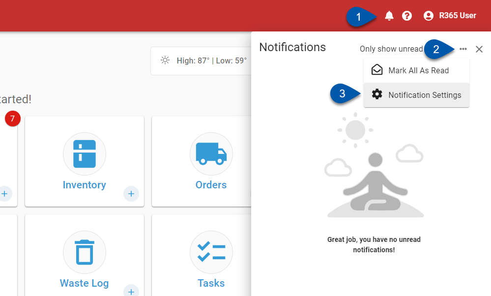 Users will always receive Notifications via the Notifications Window in Smart Ops. Notifications can also be delivered via the R365 Red App, Email, and/or SMS. The Notification will be sent to the User based on the Notification-Specific Delivery Preferences that are checked:
