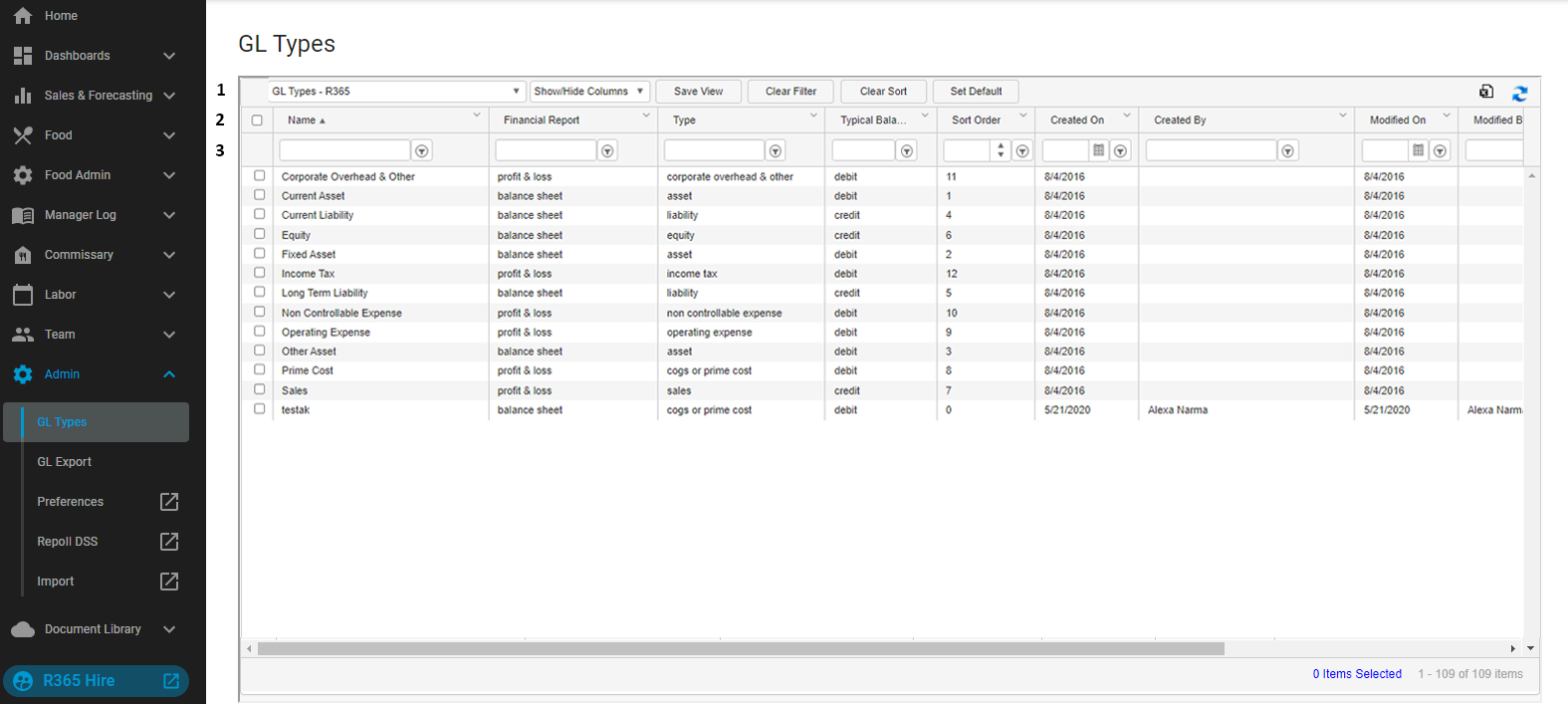 The GL Types page lists all of the GL Types created for the database. Learn more about GL Types here.