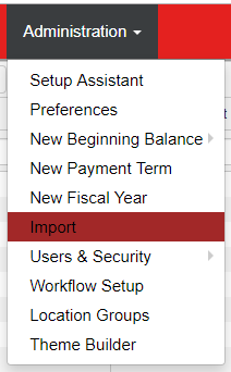 To import new Purchase Item information into R365, hover over 'Administration' in the top ribbon and click 'Import'.