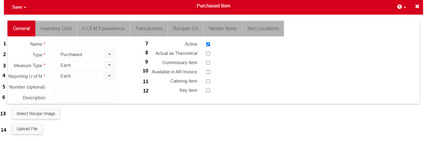 13) Select Recipe Image Button - This button is not applicable to Purchased Items and is only used on Recipe Items