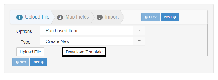 A new Import window will open. Select 'Purchased Item' in the 'Options' drop-down menu and then select 'Create New' in the 'Type' drop-down menu. Clicking 'Download Template' will download a template for you to type in new item information.