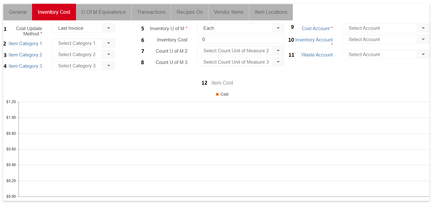 6) Inventory Cost - this field will contain the Cost associated with the Inventory U of M and will be updated based on the Cost Update Method set on the 'Purchasing' tab