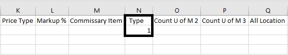 One required field that is not included on the template is the 'Type' column. This will need to be added manually before the 'Count U of M 2' column. This column also requires a numerical entry and '1' indicates that it is a Purchased Item, as shown above.