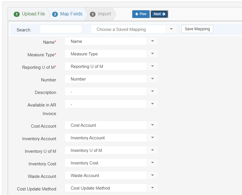 The next page will open with all of the column headers from the Import file. Review the field names to make sure that they match the column names from the template, and then click 'Next' to move on to the 'Import' tab.