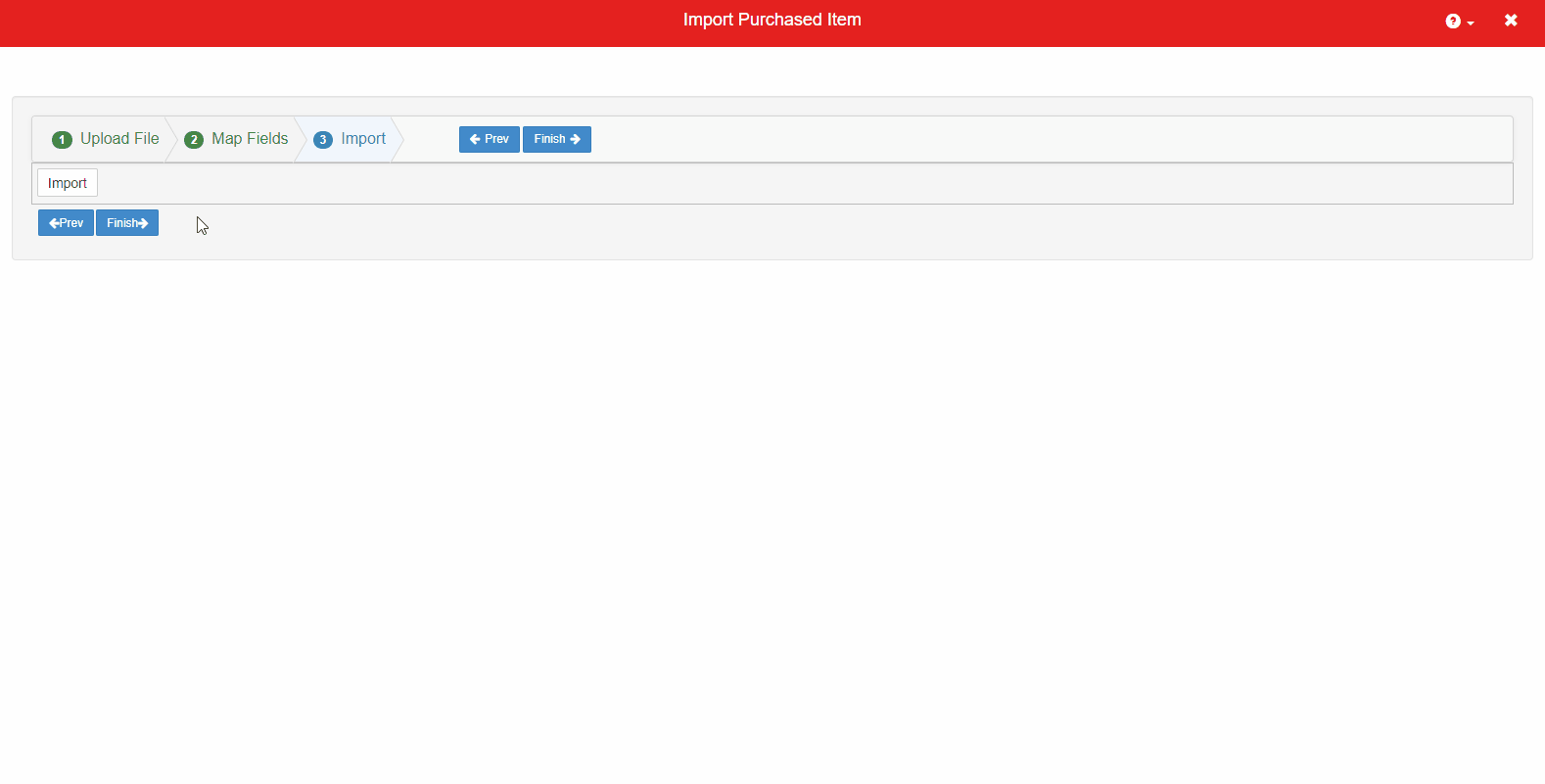 On the 'Import' tab, click the 'Import' button in the system to create your new Purchased Item. A green pop-up window will appear if the import was successful, and then click 'Finish'.