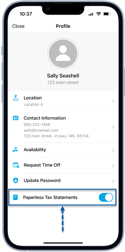 The employee can view or edit their 'Paperless Tax Statement' selection in the 'Profile' section of the R365 Mobile App.