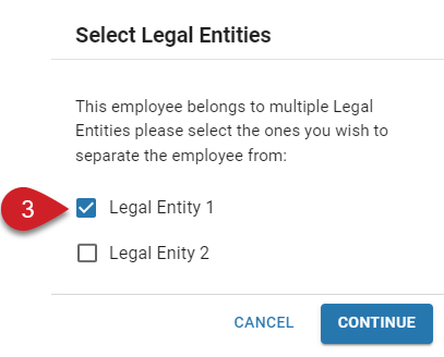 ![]() | Select legal entities for locations that the employee will be separated from. Deselect continuing legal entities for locations where the employee will remain active. | ![]() |