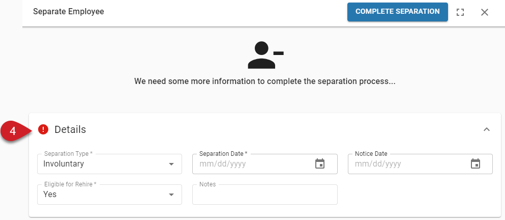 If an employee has not completed onboarding, they can still be separated, even if all of the fields normally required to save their Employee Record have not been completed. Once the employee's separation date has passed, the onboarding portions of 'My Pay' on the R365 Mobile App and the 'Summary' tab of their Employee Record will no longer be displayed.