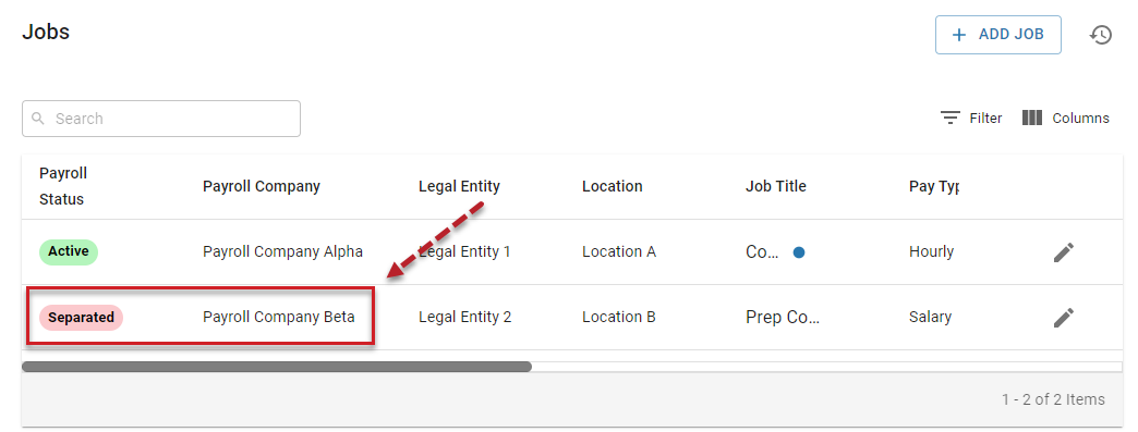 The effective end date for the employee's salary job associated with the payroll company they were separated from will be updated to the separation date. Jobs with effective end dates are viewable in the employee's job history.