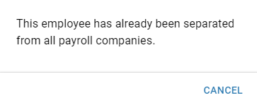 When an employee has a separation date in the future, their payroll status will not be updated to 'Separated' until the separation date has passed. If an employee has a future separation date for all payroll companies associated with them, the separation wizard will not open; instead, the following message will be displayed when attempting to open the separation wizard: 'This employee has already been separated from all payroll companies.'