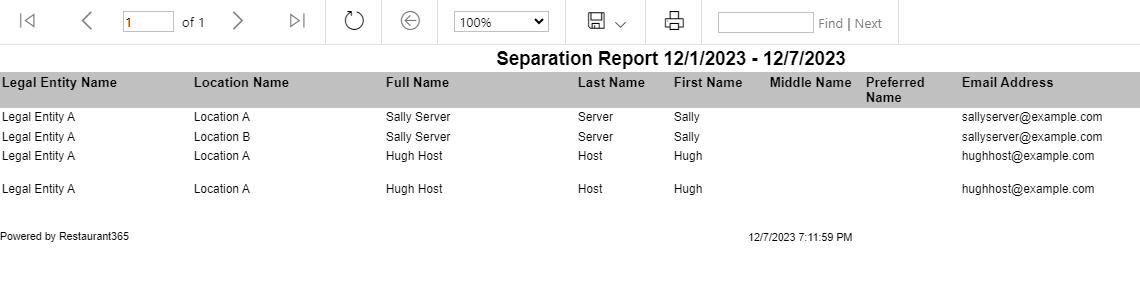 The Employee Separation report provides a list of all employees who are separated from employment, along with relevant data for those employees, such as separation date, separation type, and rehire eligibility.