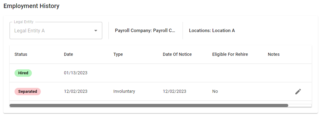 The 'Employment History' section on the Employment tab of Employee Records will show the employee's hire and separation dates for a selected legal entity. The employee's separation details for the payroll company associated with the selected legal entity can be updated here. Learn more about payroll companies, legal entities, locations, and payroll common payers here.