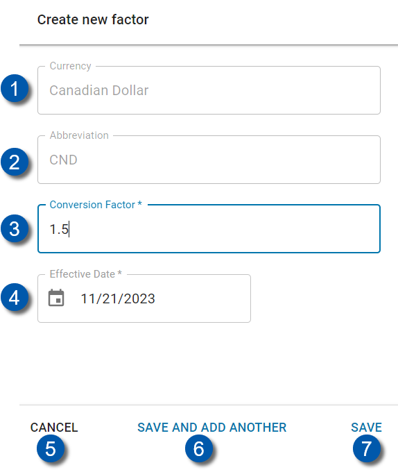 ![]() | Conversion Factor | Enter the multiplier to be used in currency conversion calculations. This field is required. |